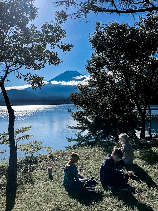 One of the best moments of the whole trip was the sunshiny, early morning hours when we woke up, got the fire going and boiled some water in the kettle. We sat on the grass, me with a hot coffee and the kids with hot chocolates, overlooking the lake and the gorgeous views of Fuji-san.